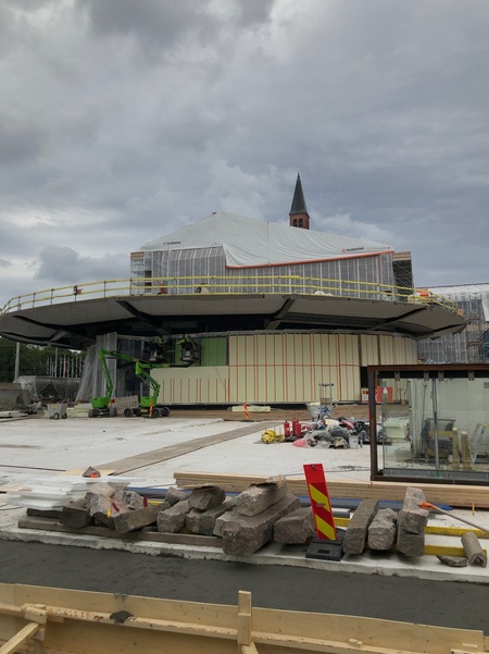 Heti työmaalle päästyämme Nikanderin johdolla mieleemme muistuivat aiemmin näkemämme, arkkitehtitoimisto JKMM Arkkitehtien havainnekuvat. Uudisrakennuksen prosessi on nimittäin edennyt niinkin pitkälle, että museopuiston ravintolapaviljonki on jo pääpiirteittäin valmis. Sitä ympäröivät työkalut ja raakamateriaalit osoittivat toki samalla, että uurastusta riittää edelleen vuoden 2027 avajaistavoitteen saavuttamiseksi.