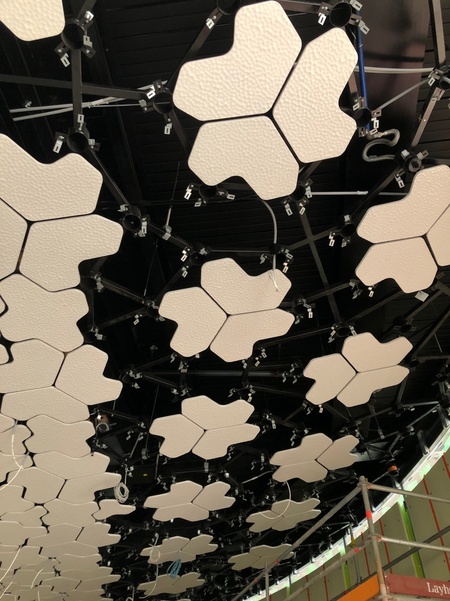 ![]() Ravintolapaviljongin keraamisia laattoja. Valtaosa niistä on jo asennettu kattoon. |