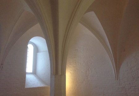 Oljet laitettiin lattialle vuoteeksi ja nuotio keskelle lämmöksi. Sattuikin usein tulipaloja. Nuotio korvattiin turvallisemmalla hiilipannulla myöhemmin. Työväki asui alimpana arvojärjestyksen mukaisesti. He eivät saaneet nousta ylempiin kerroksiin. Näin ollen linnan kappelikin oli kivijalassa, että he pääsivät jumalanpalvelukseen, johon heidän edellytettiin menevän. Palvelus oli latinaksi. Saarnan ymmärtämiseksi seinille oli maalattu raamatullisia kuvia. Pitkästyttävää taisi olla siitä huolimatta! Tämä ala – kappeli oli myöhemmin linnan leipomona. Seinäkuvat oli kalkittu valkoiseksi, joten niitä emme päässeet ihmettelemään.