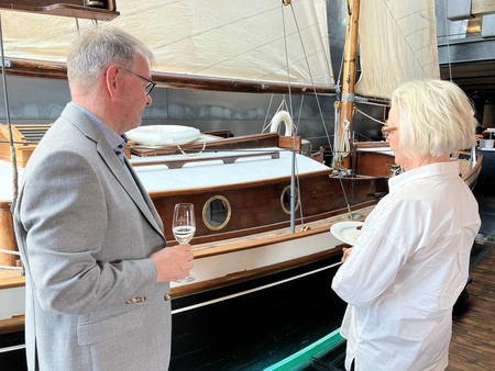 Sitten olikin lounaan aika Merikeskuksen yhteydessä toimivassa ravintola Göranissa. Ravintolan vetonaulana on purjevene Daphne, jonka Göran Schildt on tehnyt kuuluisaksi monilla lukuisille kielille käännetyillä kirjoillaan. Lounaan lomassa kuulimme Daphnen vaiheista alkaen valmistumisesta Ruissalon telakalla Turussa vuonna 1935 päätyen entisöitynä Forum Marinumin veneen mittojen mukaan remontoituun ravintolatilaan vuonna 2002. Paneuduimme myös Daphnen ensimmäiseen purjehdukseen vuonna 1947. Matka suuntautui Ruotsin ja Tanskan poikki ensin Pohjanmerelle ja siitä Ranskan kanavien kautta Välimerelle ja edelleen Italian Rapalloon. Kirjailija toteutti näin talvisodan rintamalla sisimmässään virinneen lähtemättömän ajatuksen: Jos minä tästä selviän hengissä, purjehdin omalla veneellä Välimerelle. Jotkut meistä käyttivät hyväkseen saamaamme erikoislupaa astua (sukkasillaan) Daphnen kannelle, samalla tuli toki tarkastettua sisätilat. Eräs jäsenemme kertoi lukeneensa kaikki Göran Schildtin kirjat Daphnen matkoista, mutta pääsi vasta nyt kohtaamaan itse veneen.