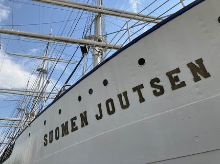 Suomen Joutsenen viiteen elämään (ranskalais- ja saksalaiskaudet, vuodet merivoimien palveluksessa sekä merimiesammattikouluna ja museolaivana) tutustuttiin kahdessa ryhmässä Tuomas Värjön ja Heidi Vanhasen opastuksilla. Tuomaksen opastuksessa painotettiin 1930-luvun nuoren kansakunnan laivaston koululaivavuosia ja Heidin opastuksessa laivan historian kerroksellisuutta kokonaisuutena. Laiva ei ollut vielä avoinna yleisölle, mutta hienoa että pääsimme ”ombord” ja samalla todistamaan laivamestarin johdolla tehtäviä huoltotöitä ennen kesäsesongin alkua.