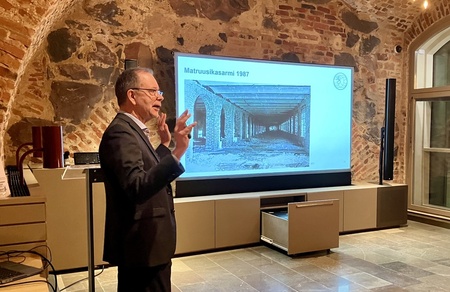 Katajanokan Merikasarmin vierailu varattiin täyteen kahdessa tunnissa. Eikä ihme, sillä varsinkaan muutama vuosi sitten valmistuneen remontin jälkeen Ulkoministeriön tiloihin ei juuri vierailuryhmiä ole päästetty. Saimme vielä isännäksemme ja oppaaksemme Jyrki Paloposken, joka on hyvin perehtynyt aiheeseen ja kirjoittanut aiheesta upean kirjan ”Merikasarmin historia”.