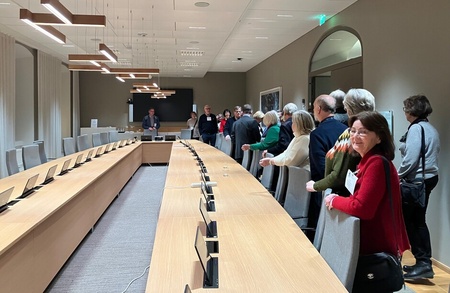 Pääsimme myös kiertämään rakennuksen käytävillä, auloissa ja neuvottelutiloissa. Tilat on nimetty edesmenneiden merkittävien Ulkoministeriössä palvelleiden mukaan. Neuvotteluhuone Hakkaraisessa ihastelimme menneen ajan tyylikkyyttä ja kuulimme sekä oppaamme että yhdistyksen puolelta vierailun järjestäneen Matti Heimosen tarinoita ulkoasianhallinnon henkilöistä ja sattumuksista. Rafael Hakkarainen nimitettiin vuonna 1921 valtiopäivien juhlamenojen ohjaajaksi ja pian myös ulkovaltojen lähettiläinen esittelijäksi eli protokollapäälliköksi, missä asemassa hän pysyi vuoteen 1945. Rafael oli siis Matin edeltäjä. Kävimme myös neuvottelutila Halosessa. Nimeämisessä oli tehty poikkeus vallitsevasta linjasta, mutta toki vakuuttavia perusteluja päätökselle löytyi. Kyseisen tilan elävöittämiseen olisi asiantuntevan jäsenistömme mielestä kuitenkin aihetta. Kaivattiin suomalaista taidetta seinille ja ikkunalaudoille.