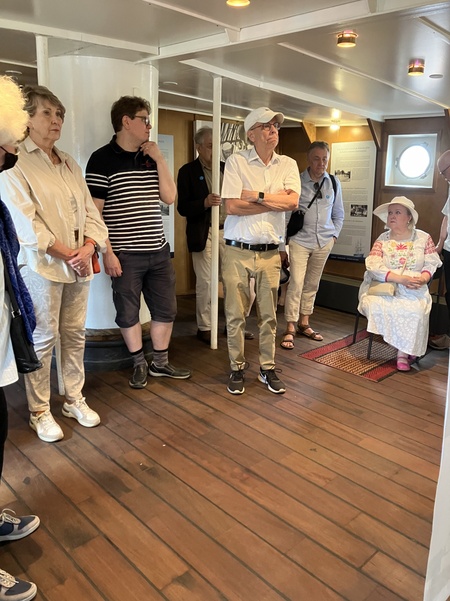 Suomen Joutsenen viiteen elämään (ranskalais- ja saksalaiskaudet, vuodet merivoimien palveluksessa sekä merimiesammattikouluna ja museolaivana) tutustuttiin kahdessa ryhmässä Tuomas Värjön ja Heidi Vanhasen opastuksilla. Tuomaksen opastuksessa painotettiin 1930-luvun nuoren kansakunnan laivaston koululaivavuosia ja Heidin opastuksessa laivan historian kerroksellisuutta kokonaisuutena. Laiva ei ollut vielä avoinna yleisölle, mutta hienoa että pääsimme ”ombord” ja samalla todistamaan laivamestarin johdolla tehtäviä huoltotöitä ennen kesäsesongin alkua.