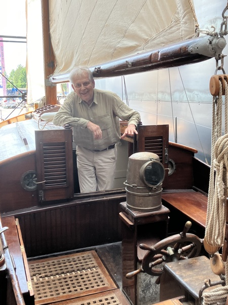 Sitten olikin lounaan aika Merikeskuksen yhteydessä toimivassa ravintola Göranissa. Ravintolan vetonaulana on purjevene Daphne, jonka Göran Schildt on tehnyt kuuluisaksi monilla lukuisille kielille käännetyillä kirjoillaan. Lounaan lomassa kuulimme Daphnen vaiheista alkaen valmistumisesta Ruissalon telakalla Turussa vuonna 1935 päätyen entisöitynä Forum Marinumin veneen mittojen mukaan remontoituun ravintolatilaan vuonna 2002. Paneuduimme myös Daphnen ensimmäiseen purjehdukseen vuonna 1947. Matka suuntautui Ruotsin ja Tanskan poikki ensin Pohjanmerelle ja siitä Ranskan kanavien kautta Välimerelle ja edelleen Italian Rapalloon. Kirjailija toteutti näin talvisodan rintamalla sisimmässään virinneen lähtemättömän ajatuksen: Jos minä tästä selviän hengissä, purjehdin omalla veneellä Välimerelle. Jotkut meistä käyttivät hyväkseen saamaamme erikoislupaa astua (sukkasillaan) Daphnen kannelle, samalla tuli toki tarkastettua sisätilat. Eräs jäsenemme kertoi lukeneensa kaikki Göran Schildtin kirjat Daphnen matkoista, mutta pääsi vasta nyt kohtaamaan itse veneen.