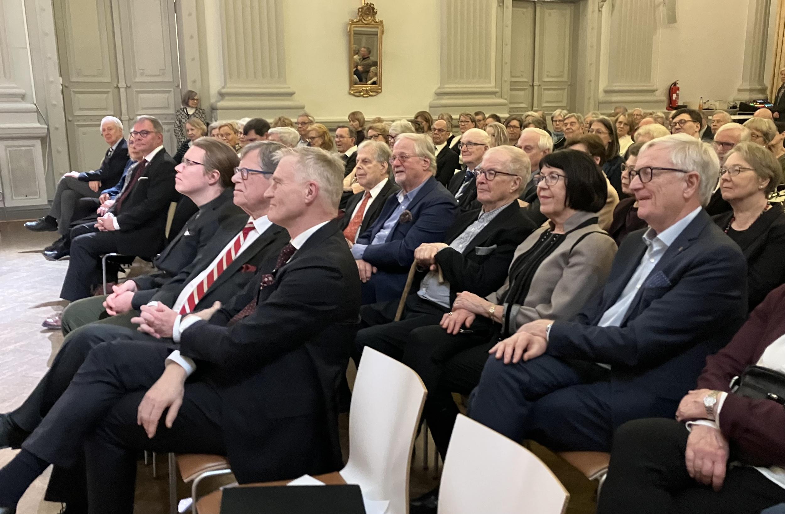 Meitä oli yli 100 henkeä paikalla Yhdistyksemme perinteitä huokuvassa G 18-juhlatilassa Yrjönkadulla. Puheenjohtajan tervetulotoivotusten jälkeen Suomen Kansallismuseon ylijohtaja Elina Anttila esitti tervehdyksensä juhlaväelle. Lämminhenkinen sekä kiittävä ja kannustava puhe kuultiin ja nähtiin nauhoitettuna Elinan Afrikkaan suuntautuneen työmatkan vuoksi.