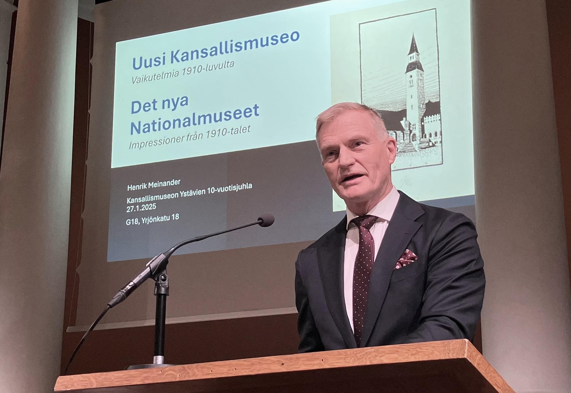Professori Henrik Meinander piti juhlapuheen aiheesta ”Uusi Kansallismuseo – vaikutelmia 1910-luvulta”, joka antoi hyvin ajankuvaa Kansallismuseon syntyvaiheista. Monenlaista epävarmuutta liittyi silloinkin museon avaamiseen. Uuden kirjansa Helsingfors – Historien om en stad (Schildts & Söderströms 2025) myötä Meinander on perehtynyt tähänkin kiinnostavaan ja vähän tutkittuun aikakauteen, jolloin Suomen Kansallismuseo valmistui ja avasi ovensa vuonna 1916.